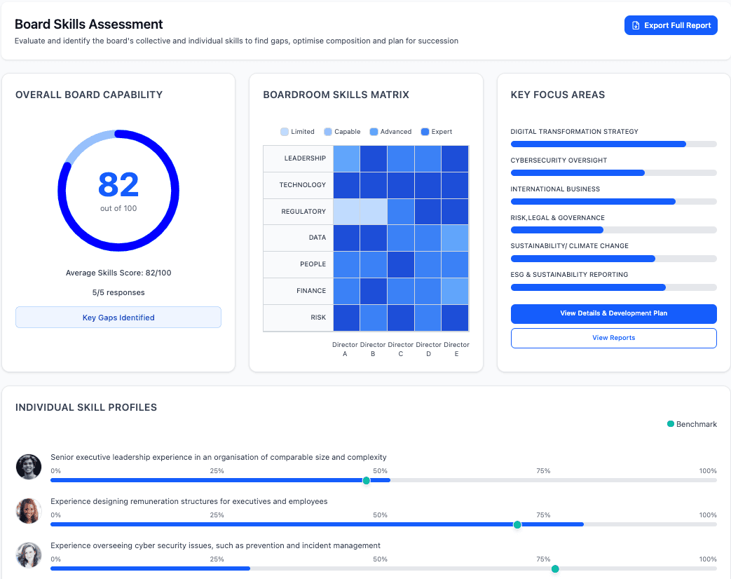 An effective board is built on the right mix of skills, experience, and perspectives. Directors with skills aligned to the organisation’s strategy and operating environment are better positioned to ask insightful questions, challenge assumptions, and guide management to deliver on strategic priorities. Directors simply rate their individual and collective expertise across a range of skill areas to: